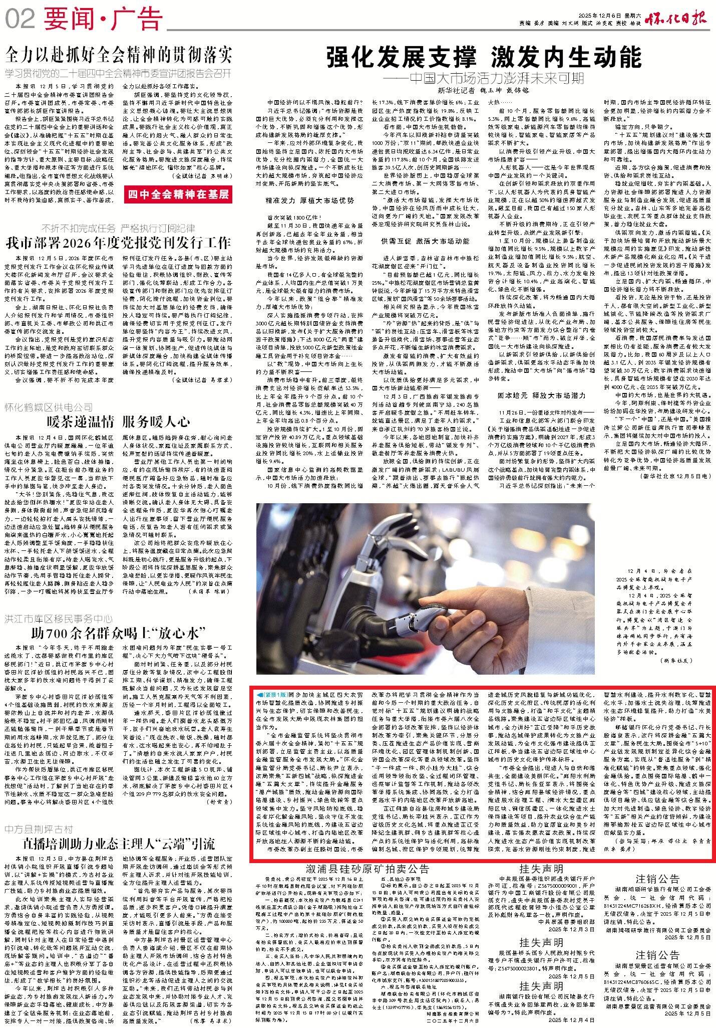 “全会通过的《建议》站位高远、思路清晰、举措有力,为国有企业在未来发展中提升竞争力、优化布局提供了重要指导。”怀化市城发集团党委书记、董事长林华表示,将坚决贯彻全会精神,聚焦“港产城旅”深度融合,深度融入“五新四城”战略和“5+10”现代化产业建设大局,以深化市场化体制机制改革为动力,以高铁新城、仙人桥两大片区开发与产业导入为重点,加快培育新质生产力,做强做优做大国有企业,为怀化提升城市能级、建设五省边际区域性中心城市贡献国企力量。